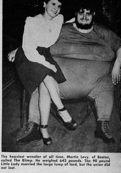 Martin "The Blimp" Levy was billed as "the heaviest wrestler of all time" He could give the McGuire Twins a run for their money!  Sadly, he was unlucky in love it seems. Whoa Nellie!